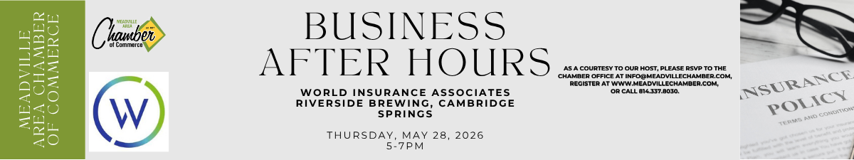 As a courtesy to our host, please RSVP to the Chamber office at 814-337-8030, register on our website, www.meadvillechamber.com, or email info@meadvillechamber.com.