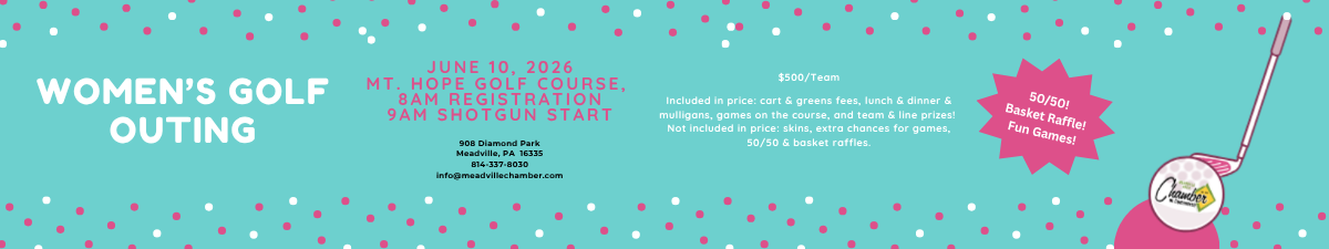 Contact the Chamber office at 814-337-8030 or email info@meadvillechamber.com to reserve your team and/or sponsorship. You can register online or Click Here to download the form.